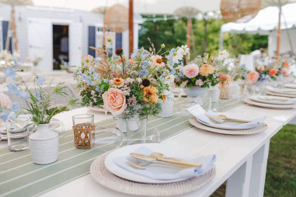 Inside the tent, the design found its softness. Golden Hour layered the space with rattan pendants from Drape Art Designs, striped linens from Reverie Social, and natural textures that felt as if a warm-weather garden party had drifted up the coast and settled comfortably in Cohasset— airy compotes tucked with peach zinnias, delphinium, cosmos, and grasses resting between woven chargers and light-blue napkins.