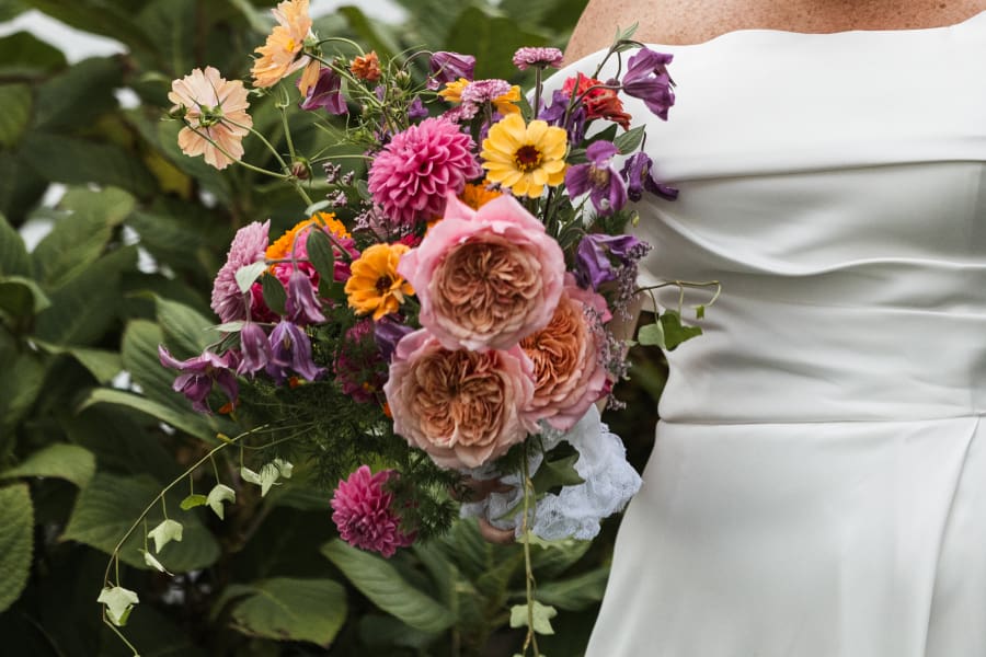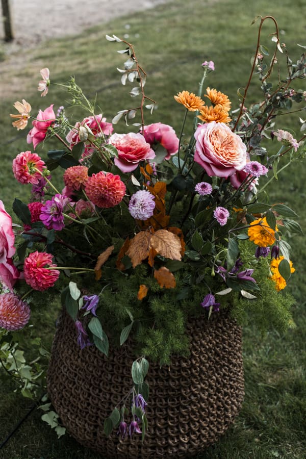 This wedding was at the tail end of summer, which meant we had access to all of the good stuff: lush dahlias, the last of the cosmos, zinnias, marigolds, and those spectacular Miyabi garden roses— wildly petaled, brown-centered, and impossibly soft.
